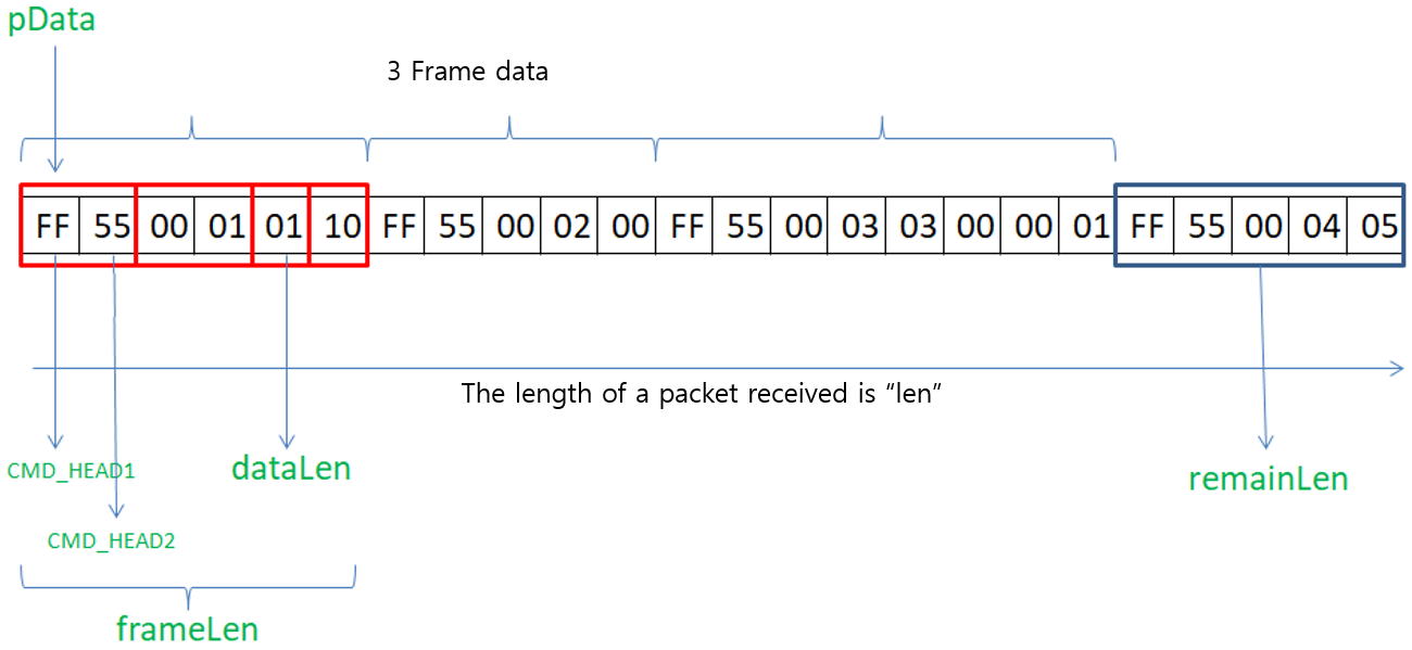while ((remainLen >= 2) && ((pData[0] != CMD_HEAD1) || (pData[1] != CMD_HEAD2))) {