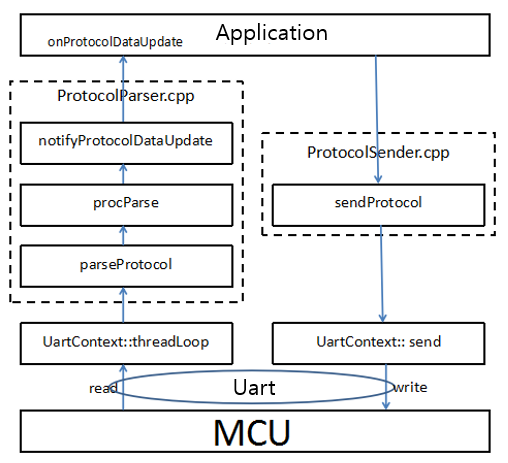 - ProtocolParser:データのプロトコル解析を完了した、次の構文解析されたデータをProtocolDataのデータ構造体に入れると同時に、アプリケーションがシリアル・データの変更を監視することができるよう、コールバックインターフェースを管理します。