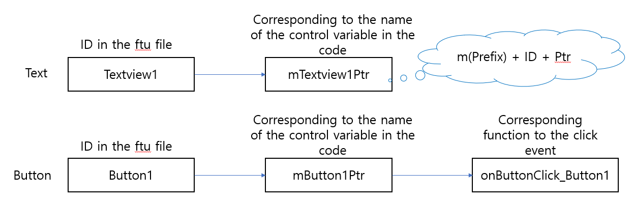 컴파일 후 해당하는 포인터 변수의 이름은 mTextview1Ptr로 생성됩니다.